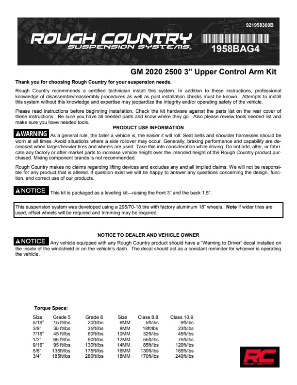 Take Your GM HD Higher: Transform your truck with Rough Country's 3-inch Bolt-On Lift Kit, delivering aggressive good looks, added clearance, and unbeatable performance at an incredible value. This kit is engineered specifically for GM HD models to provide a perfect blend of strength, drivability, and style. Engineered for Easy Installation: Featuring a 100% bolt-on installation, this kit requires no cutting, drilling, or special tools, making it one of the easiest lift kits to install on the market. The fully reversible design also lets you return your truck to stock height at any time without hassle. Unmatched Strength and Geometry: At the heart of this kit are high-articulation forged solid aluminum upper control arms. Built with a one-piece design to eliminate weak welded points, these arms deliver superior strength and durability. Optimized axle geometry is maintained through differential drop brackets, keeping driveline angles in check to reduce wear while extending long-term performance. POM ball joints come pre-installed for quicker setup and smoother articulation, with the option to upgrade to a bold red finish for added style. Premium Ride Quality: This kit includes a set of forged torsion bar keys for uncompromising rigidity, as well as Rough Country's nitrogen-charged N3 shocks for improved performance on and off-road. For those looking to push performance even further, this kit is compatible with all shock options, including Rough Country's premium Vertex reservoir shocks. All-Inclusive, All-Around Performance: With everything you need right out of the box, this lift kit provides the clearance to run larger tires while delivering a clean, leveled stance from front to rear. Backed by Rough Country's Limited Lifetime Replacement Warranty, this kit is the perfect choice for truck owners who demand strength, reliability, and a factory-quality ride at a fraction of the cost.